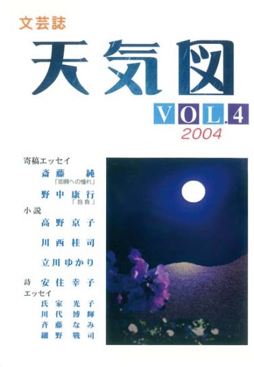 天気図 4号 著者/立川ゆかり他 A5判118頁・並製本/H16.06.20発行/¥823(税込) 毎回豪華な顔ぶれからはじまる「天気図4号」。今号の巻頭を飾るのは斎藤純氏。「天気図」という文学の洗練された前線がどう変化していくのか、毎号とても楽しみなところ。 |