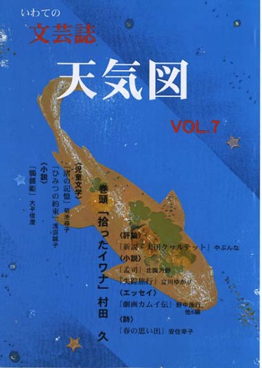 天気図 7号 編集/天気図事務局 A5判128頁・並製本/H20.12.20発行/¥823(税込) 岩手在住の文芸誌の第7号。今回はラジオでおなじみのアウトドアインストラクター「村田久」氏が巻頭を担当。前作とは雰囲気がガラっと変わり、ジャンルも多岐に渡りまさにウエザー・マップのごとき「天気図」の歴史が刻まれた。 |