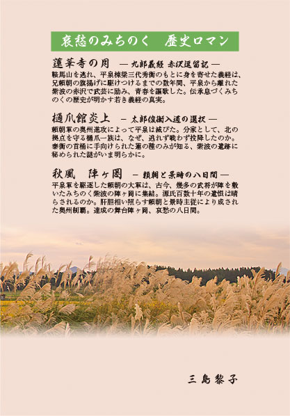 哀愁みちのく 歴史ロマン 三部作 著者/三島黎子 A5判3冊函入りセット・並製本/H24.02.10発行/¥1,646(税込) 世界文化遺産の平泉は紫波を抜きに語れない! 紫波の伝承や史跡をモチーフに展開する歴史ロマン三部作の完結編「秋風陣ヶ岡-頼朝と景時の八日間-」発刊を記念した豪華函入り3冊セット。 「蓮華寺の月-九郎義経赤沢逗留記-」(56頁・H21.02.25発行) 鞍馬山を逃れ、平泉棟梁三代秀衡のもとに身を寄せた義経は、兄頼朝の旗揚げに駆けつけるまでの数年間、平泉から離れた紫波の赤沢で武芸に励み、青春を謳歌した。伝承息づくみちのくの歴史が明かす若き義経の真実。 「樋爪館炎上-太郎俊衡入道の選択-」(80頁・H22.06.25発行) 頼朝軍の奥州進攻によって平泉は滅びた。分家として、北の拠点を守る樋爪一族は、なぜ、逃れず戦わず投降したのか。泰衡の首桶に手向けられた蓮の種のみが知る、紫波の遺跡に秘められた謎がいま明らかに。 「秋風陣ヶ岡-頼朝と景時の八日間-」(70頁・H24.02.10発行) 平泉軍を駆逐した頼朝の大軍は、古今、幾多の武将が陣を敷いたみちのく紫波の陣ヶ岡に集結。源氏百数十年の遺恨は晴らされるのか。肝胆相い照らす頼朝と景時主従により成された奥州制覇。達成の舞台陣ヶ岡、哀愁の八日間。 |