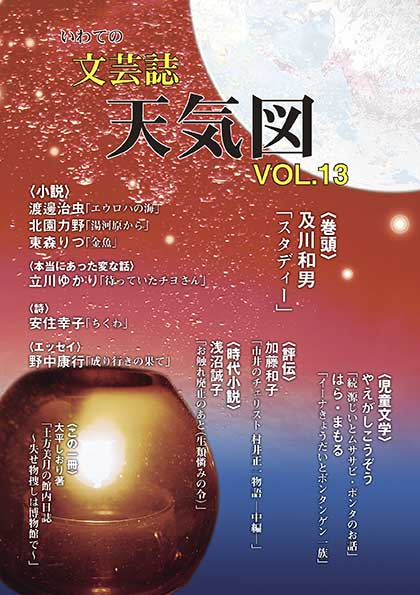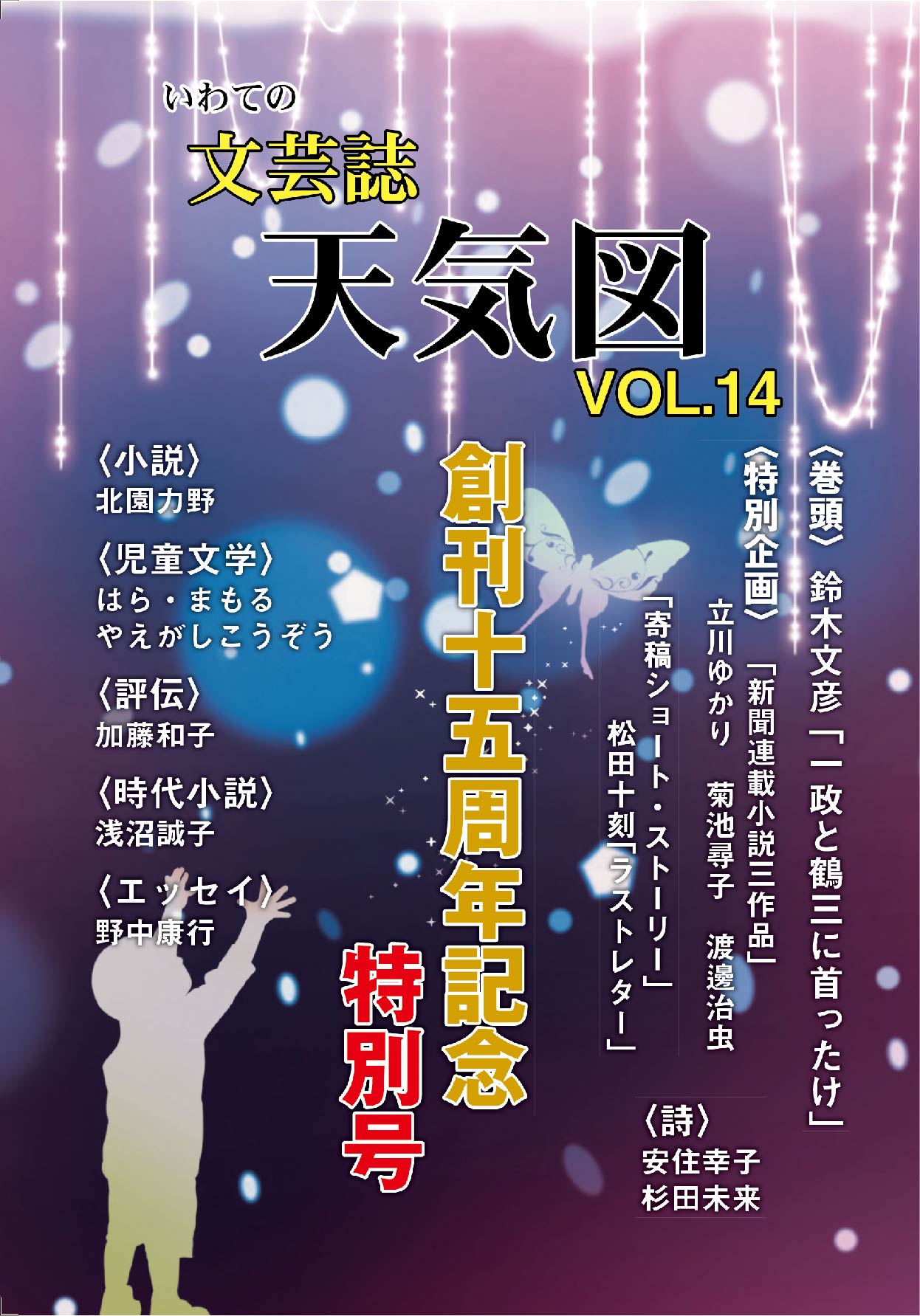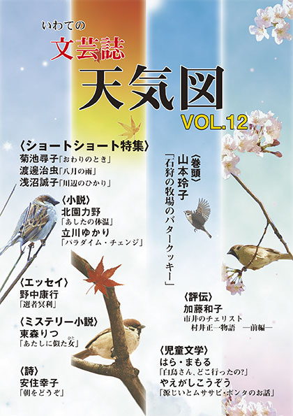 天気図 10号 編集/天気図事務局 A5判176頁・並製本/H24.01.15発行/¥823(税込) 今号は十号記念として、作家の松田十刻氏と石野晶氏に巻頭をお願いした。…今号もおなじみのメンバーが力作を書いてくれた。大人の愛を書いた北園氏。ぞくぞくするミステリーを書いた菊池氏。昔の盛岡を背景に時代小説を書いた浅沼氏。戦争ものに新挑戦の大平氏。神楽の舞台を踏むまでの少年の姿を書いたやえがし氏。震災の様子や音楽が被災者を癒す様を書いた中氏。…安住氏の詩には、神の目を感じた。野中氏のエッセイは氏ならではの温かさがあった。…今号では特別参加として渡邊氏が連作エッセイで初登場。…(編集後記より) |
