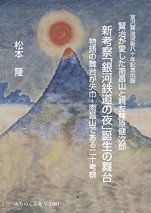 新考察「銀河鉄道の夜」誕生の舞台 物語の舞台が矢巾・南昌山である二十考察 著者/松本 隆 文庫判328頁/H26.3.1発行/¥745(税込) 宮沢賢治の童話「銀河鉄道の夜」はどのようにして生まれたのか。これらの本はその疑問にストレートに答えてくれる。賢治は盛岡中学時代、矢巾町出身の藤原健次郎と大の親友だった。しかし、健次郎は早世してしまい賢治の悲しみは計り知れないものがあった。銀河鉄道の夜は、健次郎への追慕の思いから誕生したと著者の松本隆氏は20項目にも及ぶ根拠を明快に示している。矢巾町在住の著者ならではの論考は説得力ある内容になっている。このたびの新刊は2010年発行の「童話『銀河鉄道の夜』の舞台は矢巾・南昌山」で論考を展開した9つの根拠をさらに拡大し、掘り下げたものになっている。「銀河鉄道の夜」(昭和14年十字屋書店版)も収録。 |