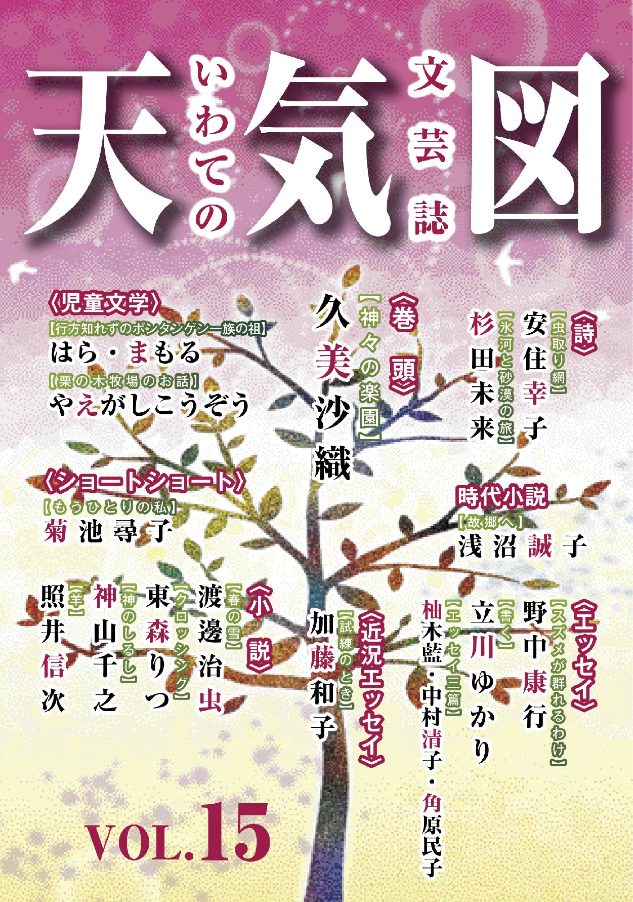 | 天気図 15号 編集/天気図事務局 A5判202頁・並製本/H29.02.28発行/¥787+(税) 巻頭特別寄稿は久美沙織。執筆陣は渡邊治虫、加藤和子、浅沼誠子、野中康行、はら・まもる、安住幸子、立川ゆかり、やえがしこうぞう、東森りつ、杉田未来、柚木藍、中村清子、角原民子、神山千之、照井信次、菊池尋子(掲載順敬称略)。 |