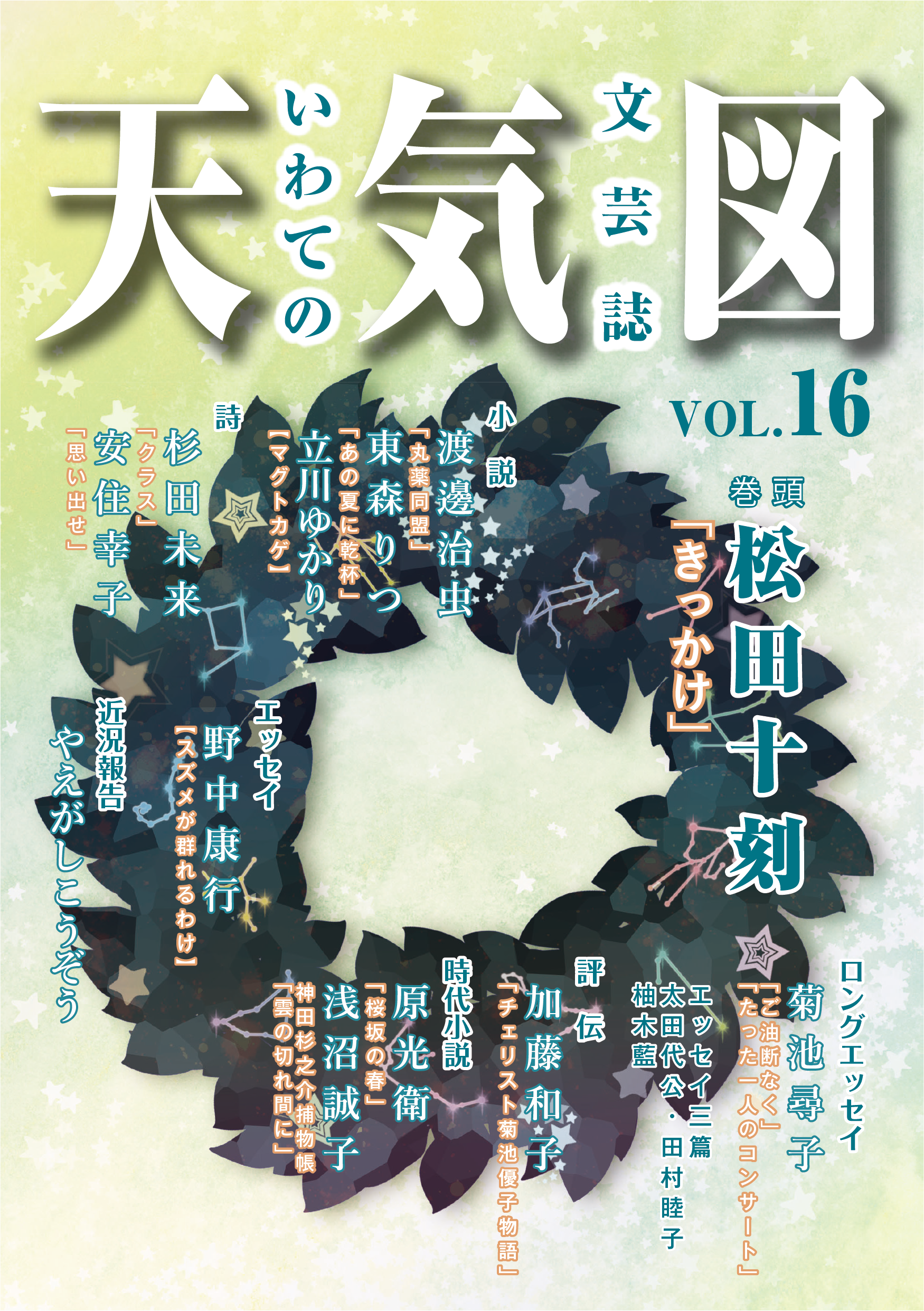 | 天気図 16号 編集/天気図事務局 A5判182頁・並製本/H30.02.28発行/¥787+(税) 巻頭特別寄稿は松田十刻。執筆陣は渡邊治虫、加藤和子、太田代公、浅沼誠子、野中康行、安住幸子、立川ゆかり、やえがしこうぞう、東森りつ、田村睦子、柚木藍、原光衛、杉田未来(掲載順敬称略)。 |